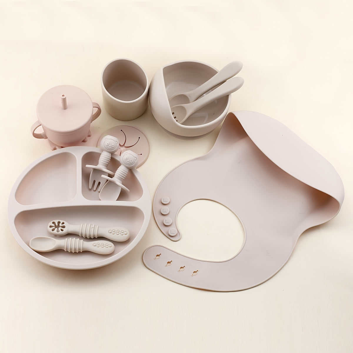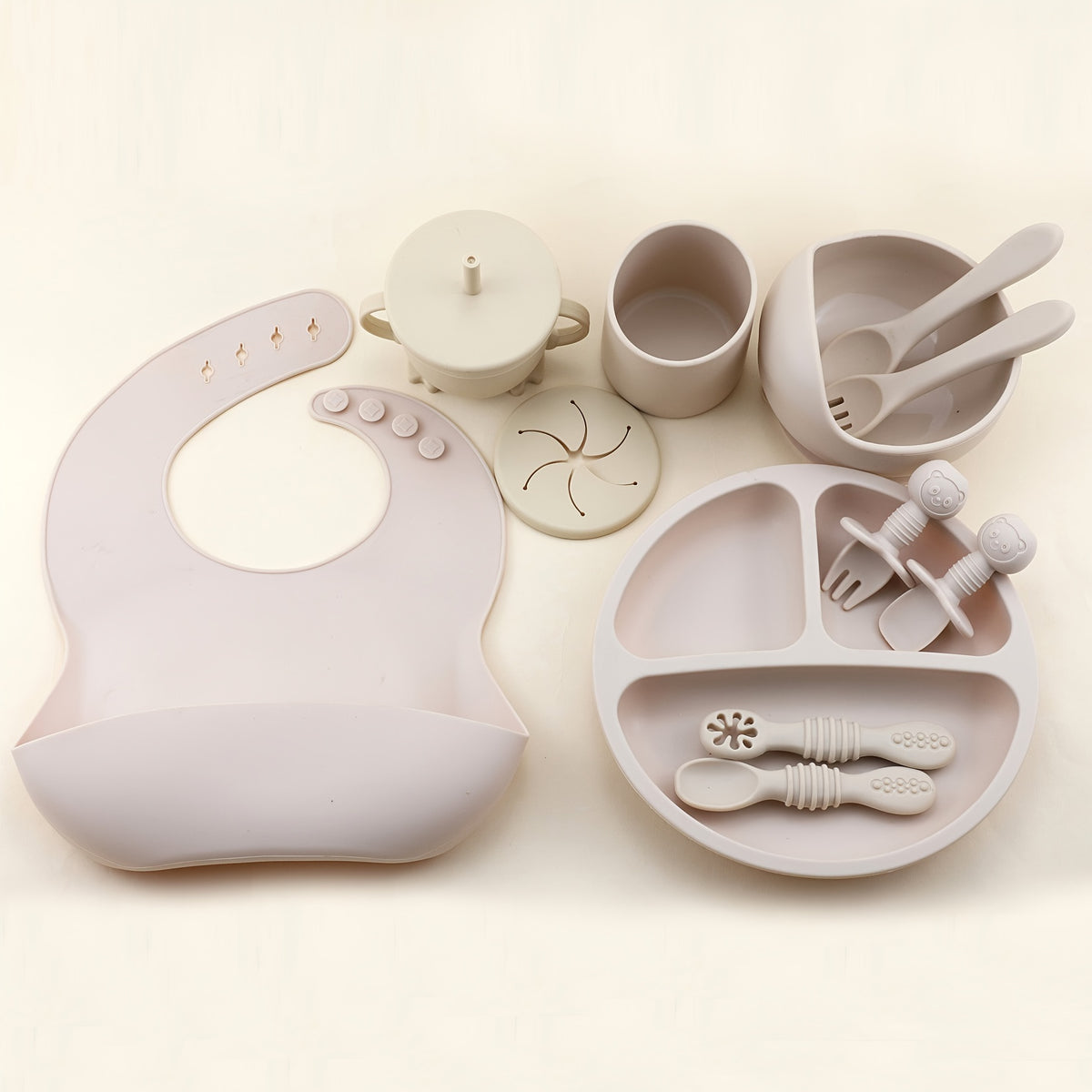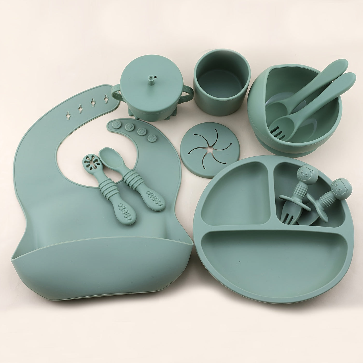 12pcs Silicone Youngsters Feeding Set - Includes Suction Bowl, Divided Plate, Spoon & Fork, Sippy Cup with Adjustable Bib - Perfect for Youngsters Learning to Self-Feed - Available in Cream, Red, Green, Blue - Olive