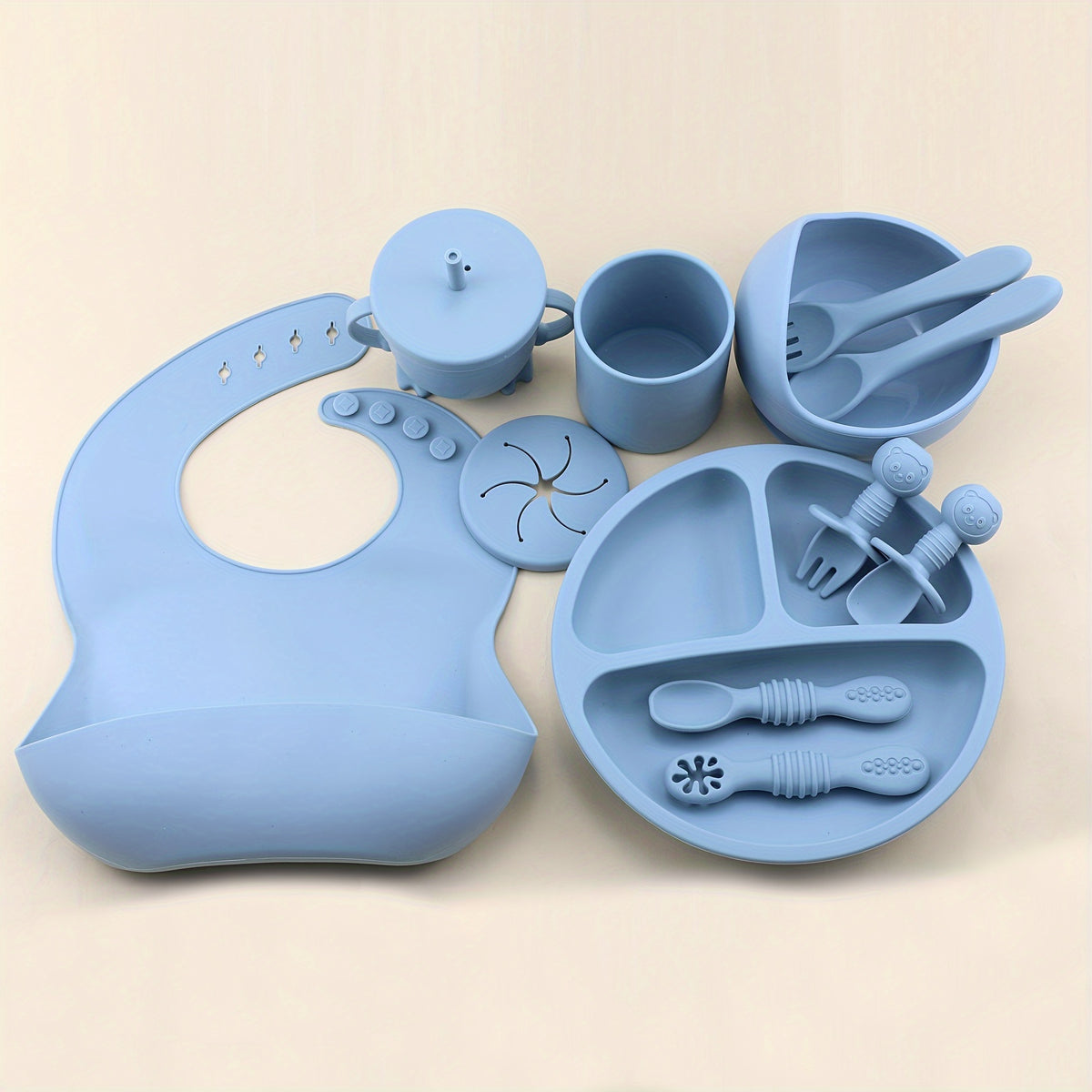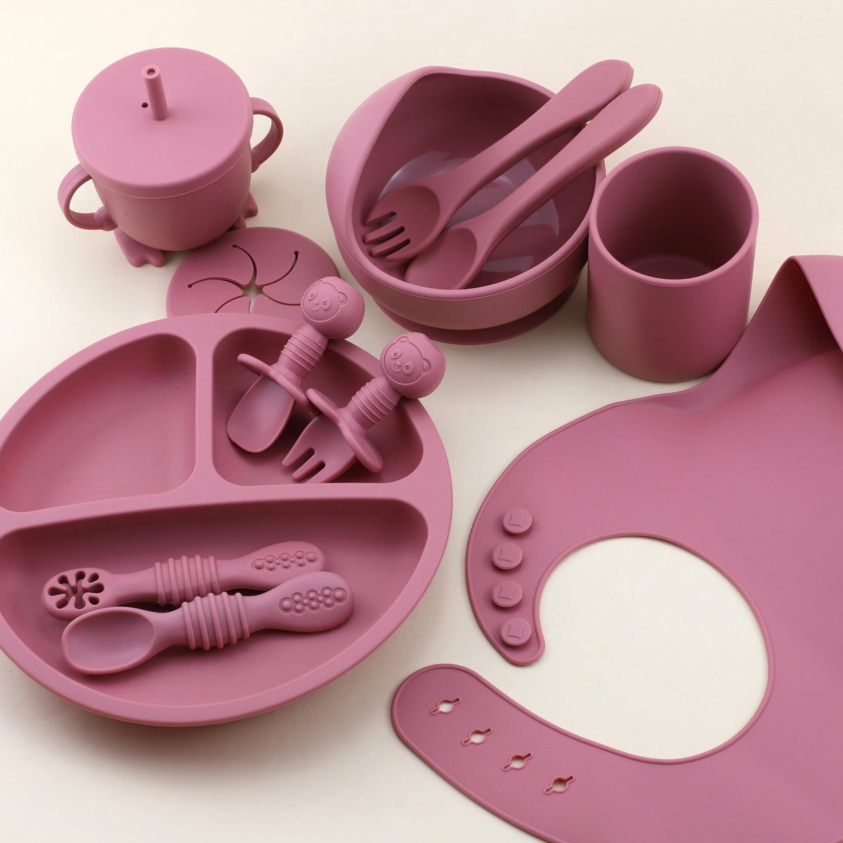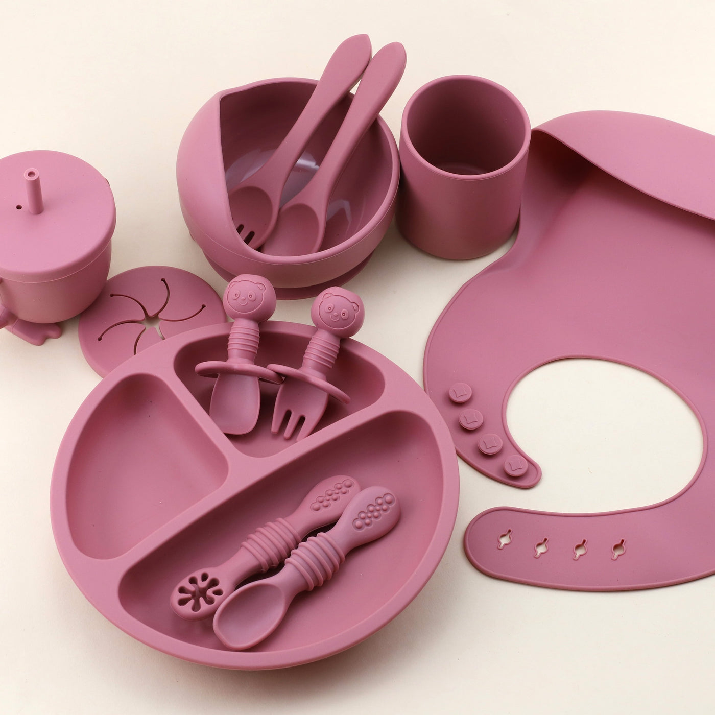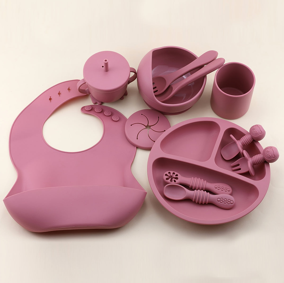12pcs Silicone Youngsters Feeding Set - Includes Suction Bowl, Divided Plate, Spoon & Fork, Sippy Cup with Adjustable Bib - Perfect for Youngsters Learning to Self-Feed - Available in Cream, Red, Green, Blue - Olive