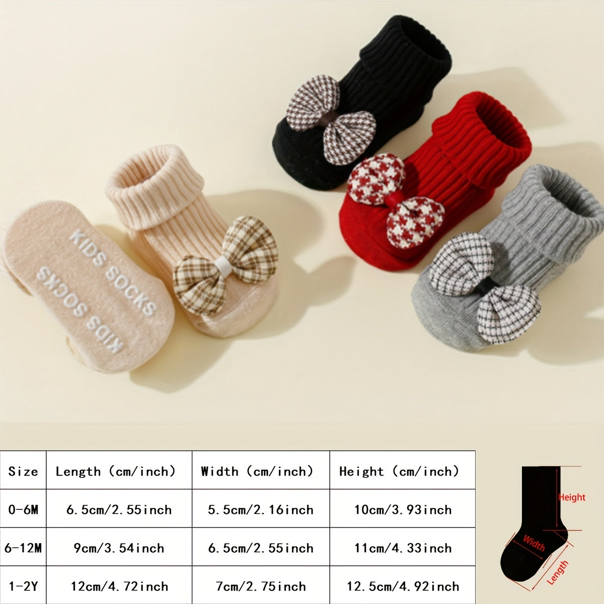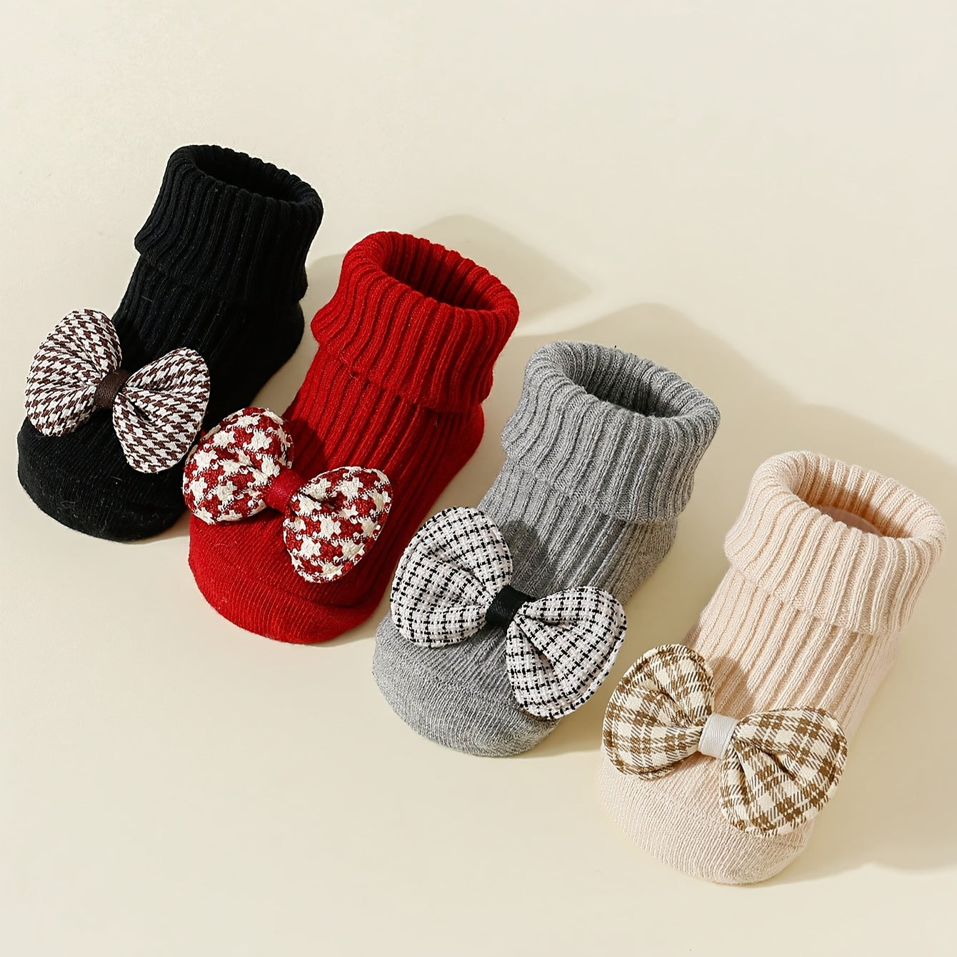 4 Pairs of Girls' Plaid Bow Mid-Calf Socks Non-Slip Dot Glue Mid-Calf Socks - 026 Sock Head Houndstooth Bow Tie 4/black Red Gray Card / 6-12M