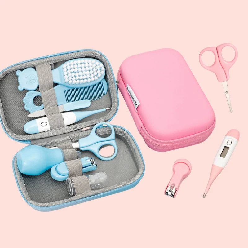 8PCS Baby Care Cleaning Set Nail Clippers Comb Head Massage Nasal Aspirator Thermometer Soft Bristle Brush Children Grooming Kit - pink 8pcs set
