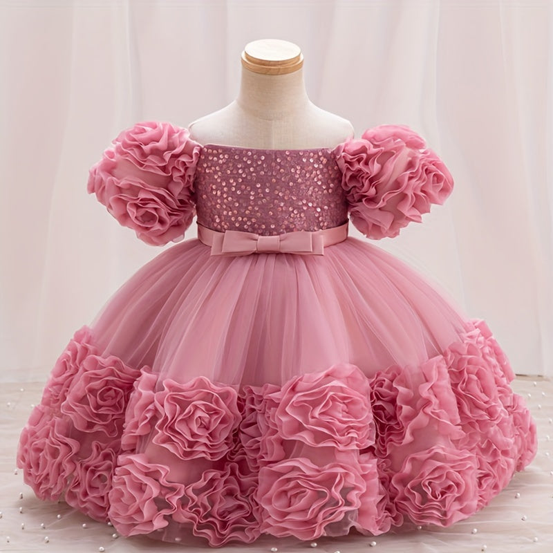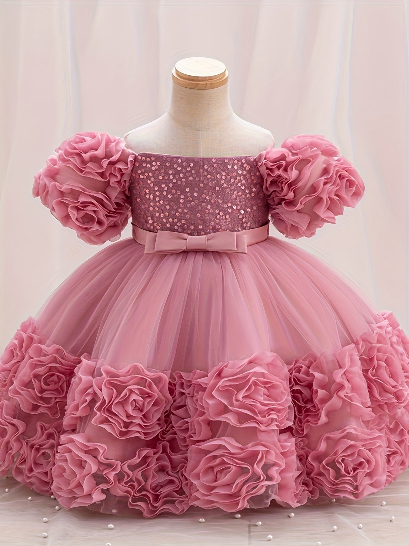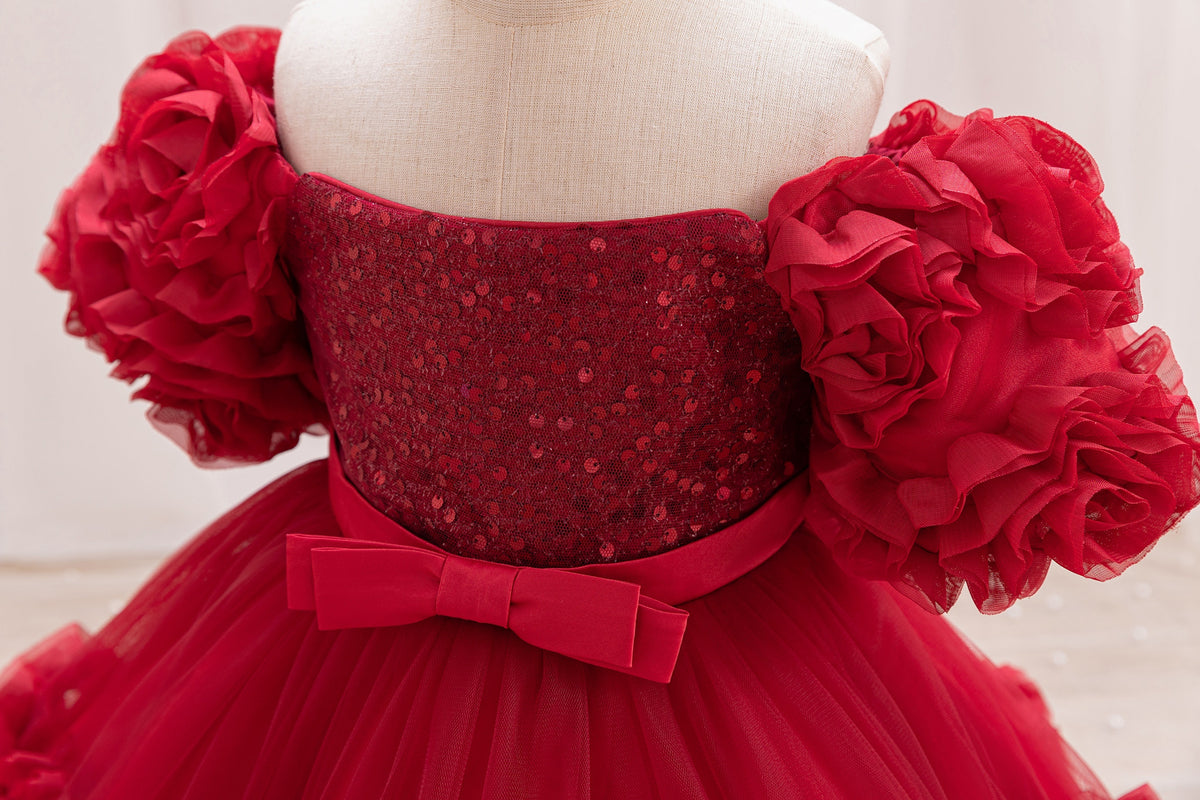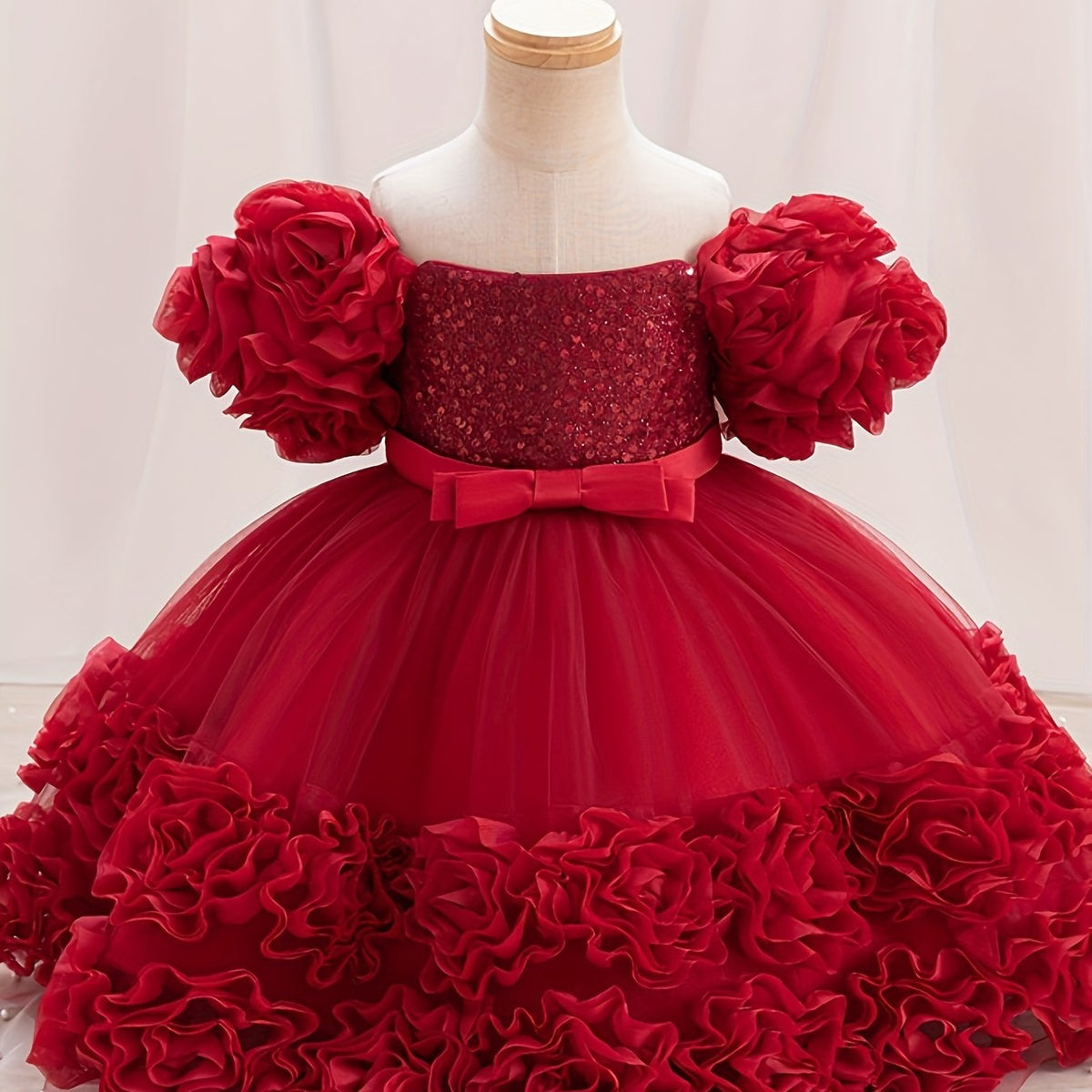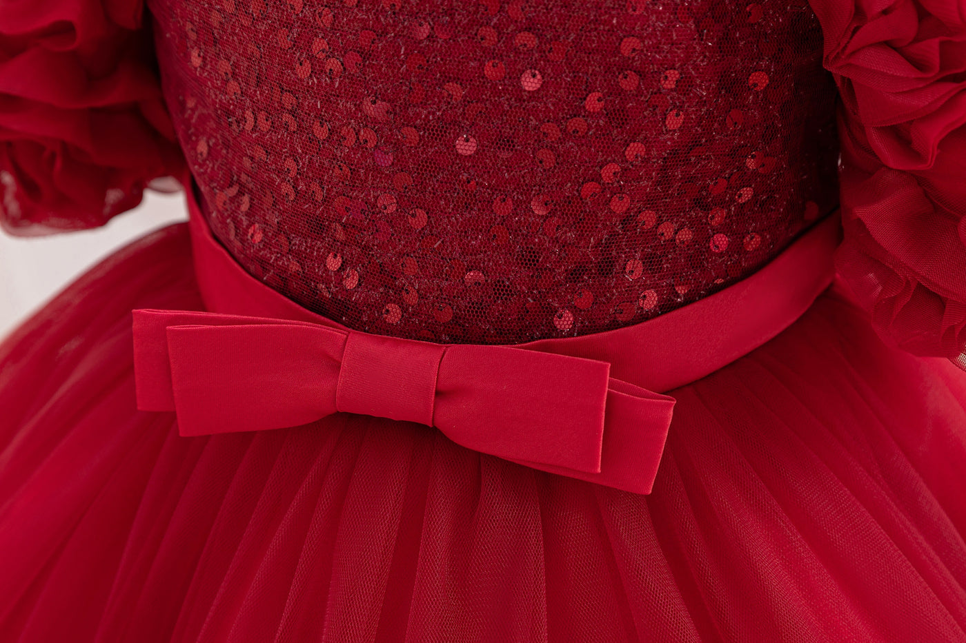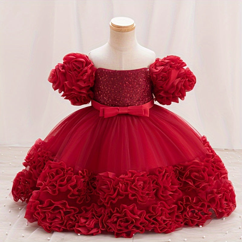 Elegant Girls' Pink Princess Dress with Sparkling Sequin Detail - Puff Sleeves, Knee-Length, Polyester & Viscose Blend, Perfect for Pageants, Hosting & Piano Performances, Princess Dresses for Girls - crimson / 9-12M
