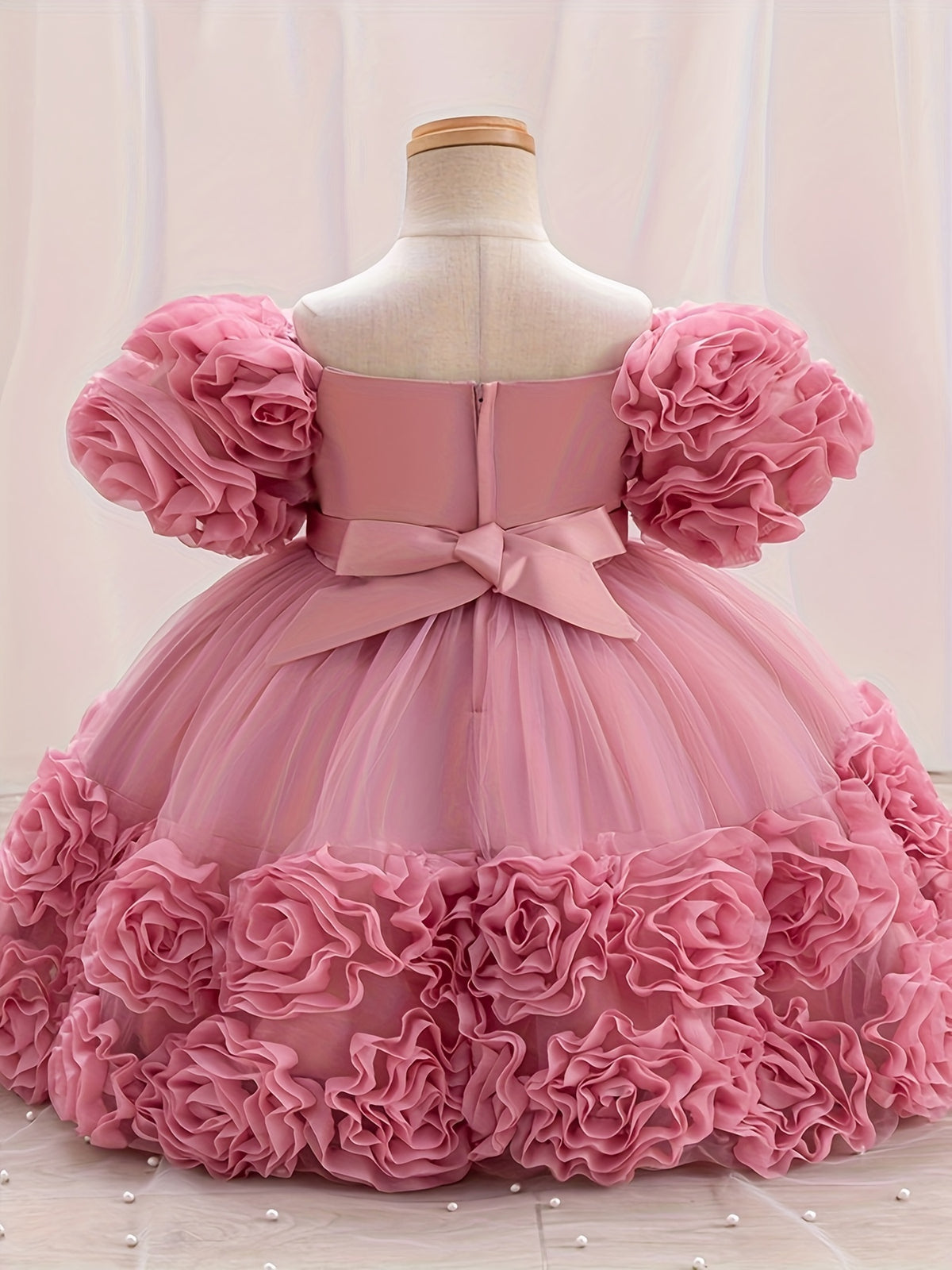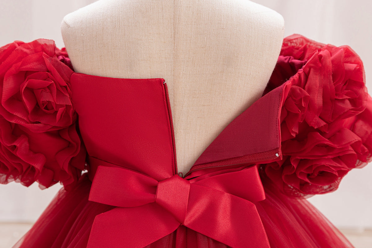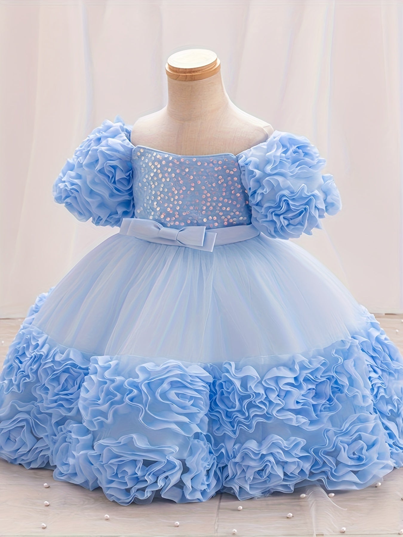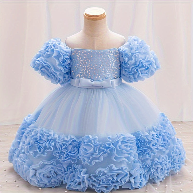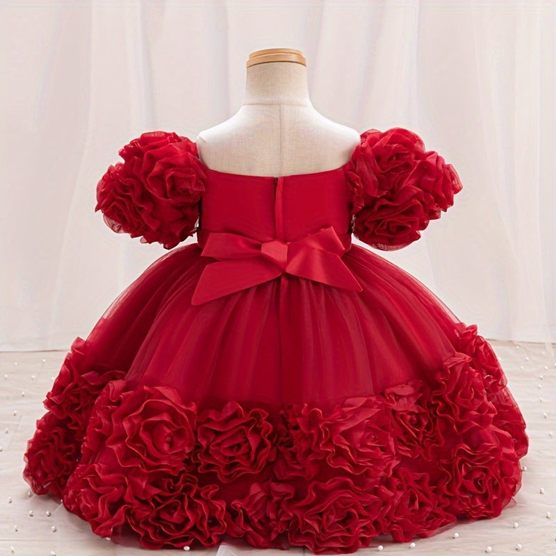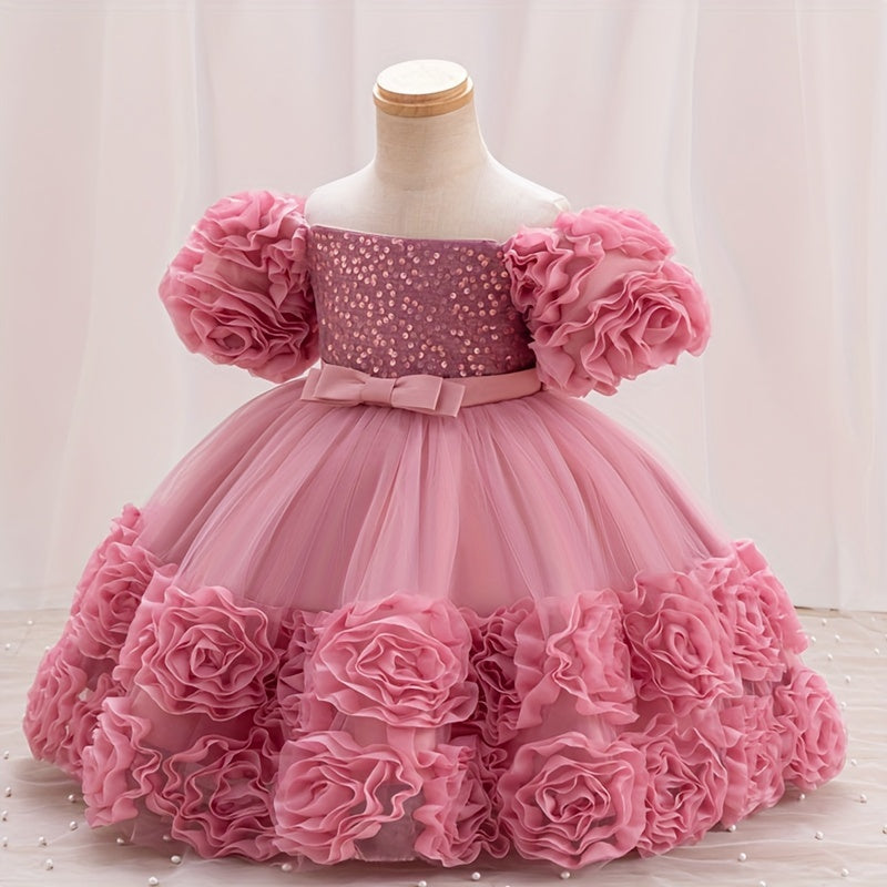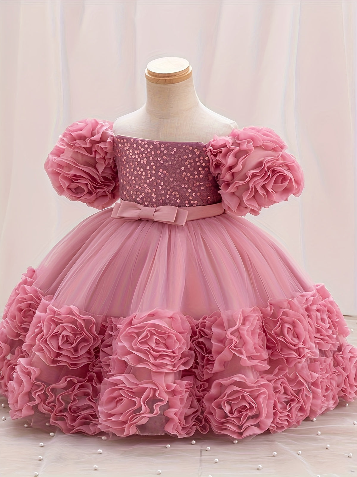 Elegant Girls' Pink Princess Dress with Sparkling Sequin Detail - Puff Sleeves, Knee-Length, Polyester & Viscose Blend, Perfect for Pageants, Hosting & Piano Performances, Princess Dresses for Girls - crimson / 9-12M