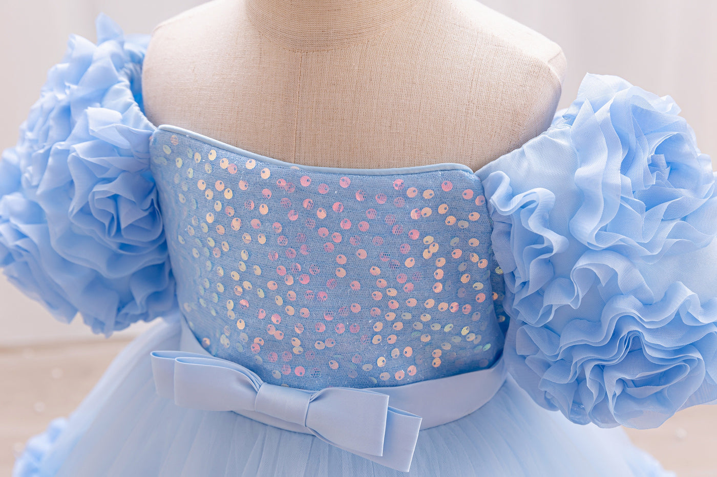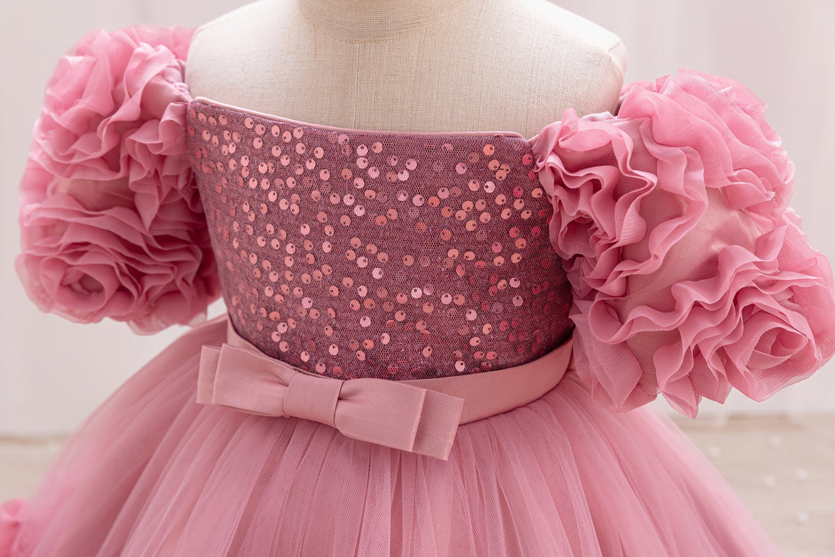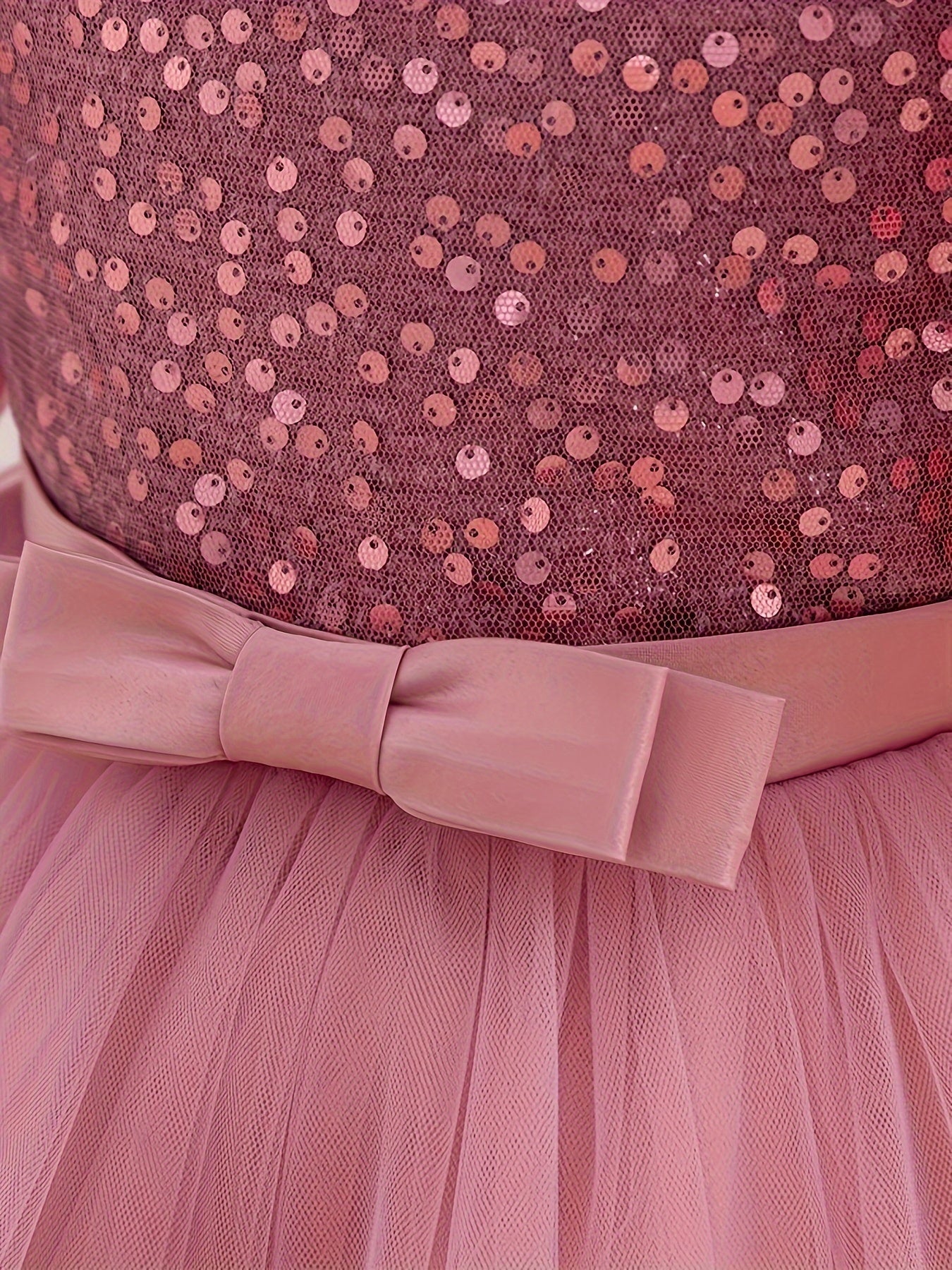 Elegant Girls' Pink Princess Dress with Sparkling Sequin Detail - Puff Sleeves, Knee-Length, Polyester & Viscose Blend, Perfect for Pageants, Hosting & Piano Performances, Princess Dresses for Girls