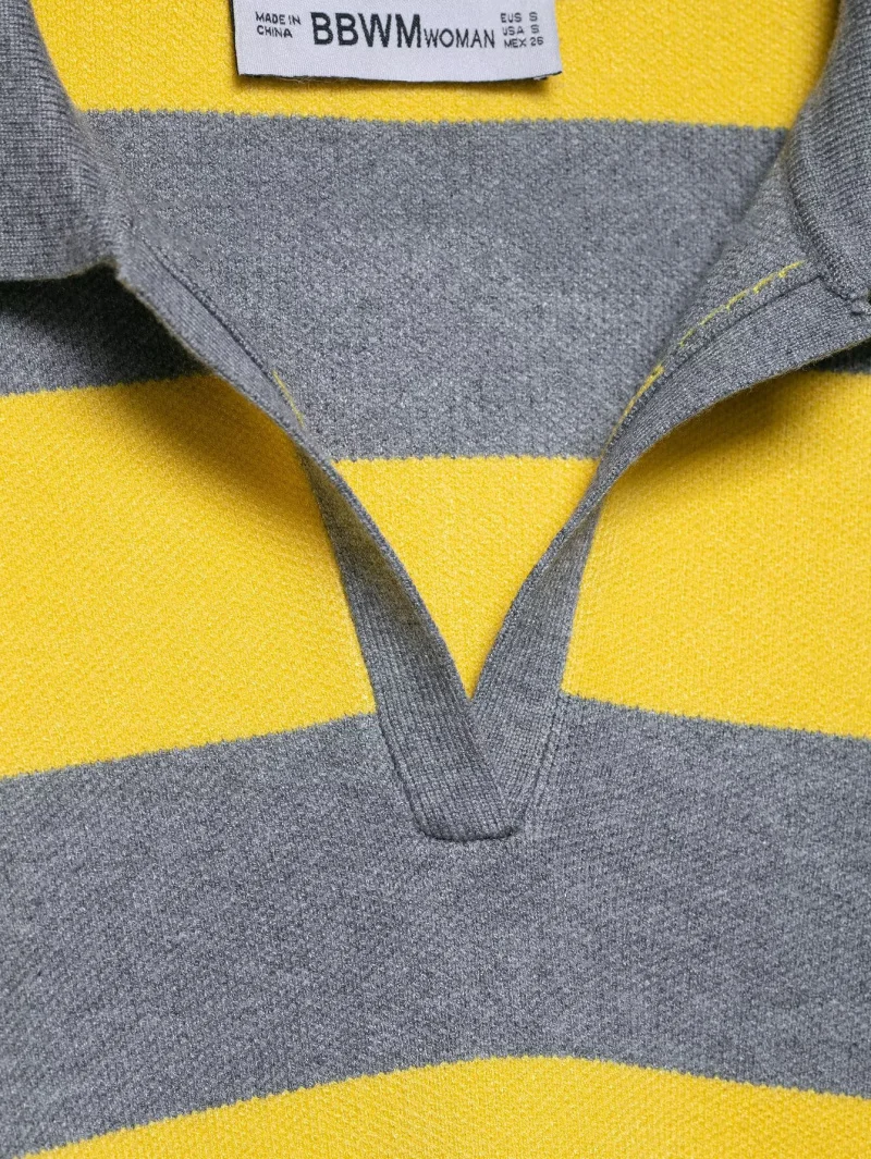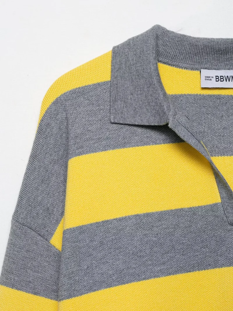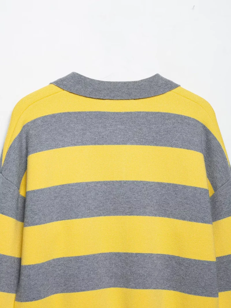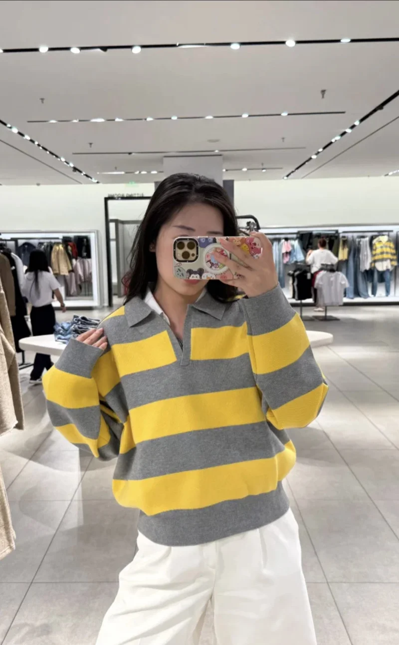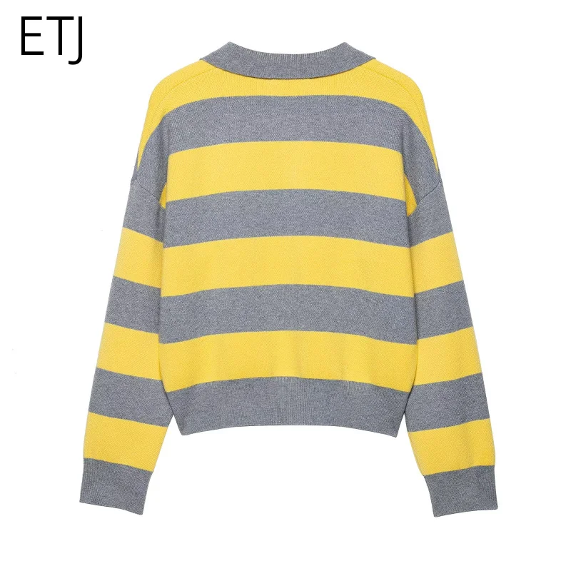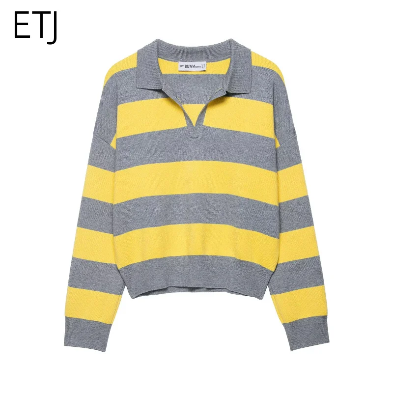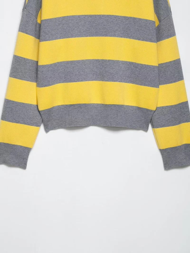 ETJ 2025 Autumn women's new line street style fashion yellow wide stripe polo neck loose version of long-sleeved sweater - htw / M